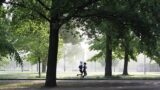 胸の前で肘を曲げ、腕を交差させるストレッチ。20秒。